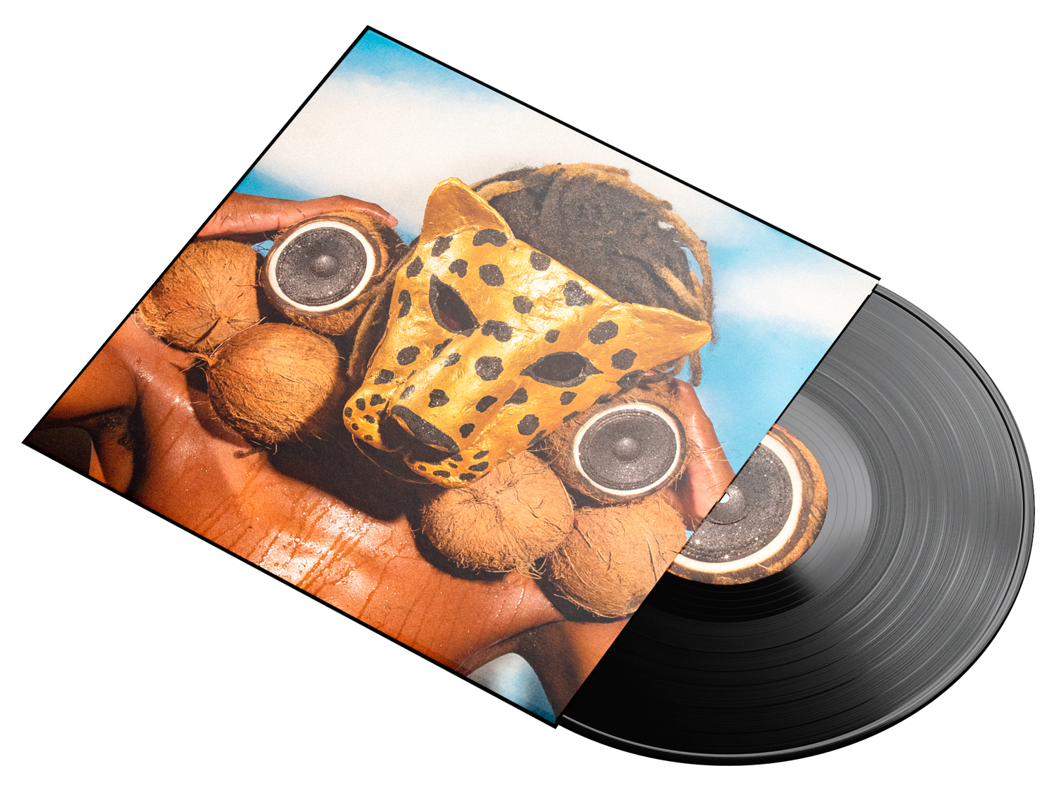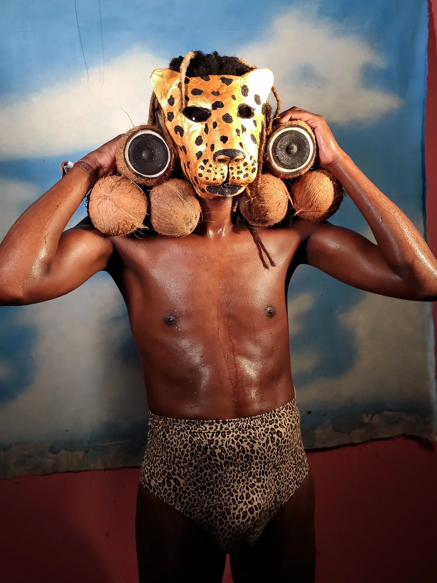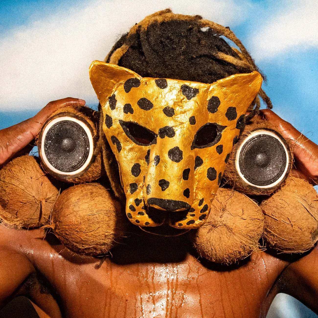 Com um visual vibrante e meio surreal, o dourado da máscara contrasta com os tons terrosos do coco e da pele suada, enquanto o céu ao fundo reforça a sensação tropical e solar da cena, explorando materiais simples e texturas.