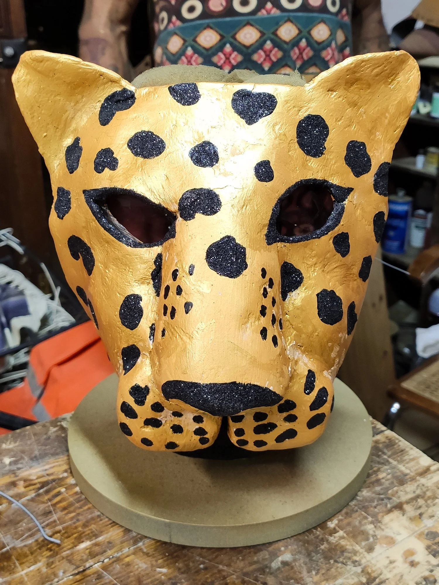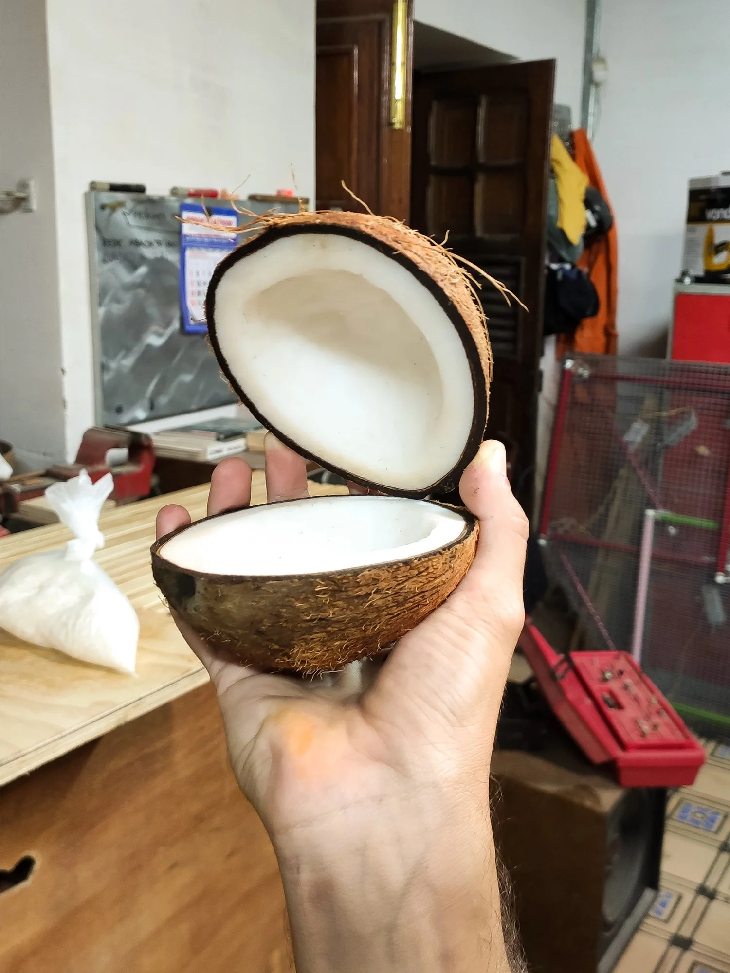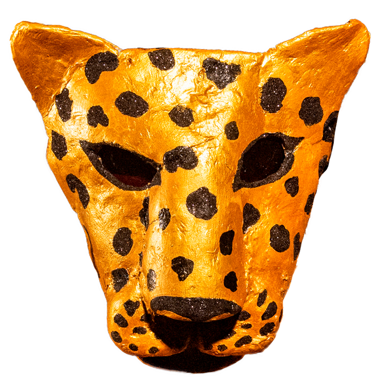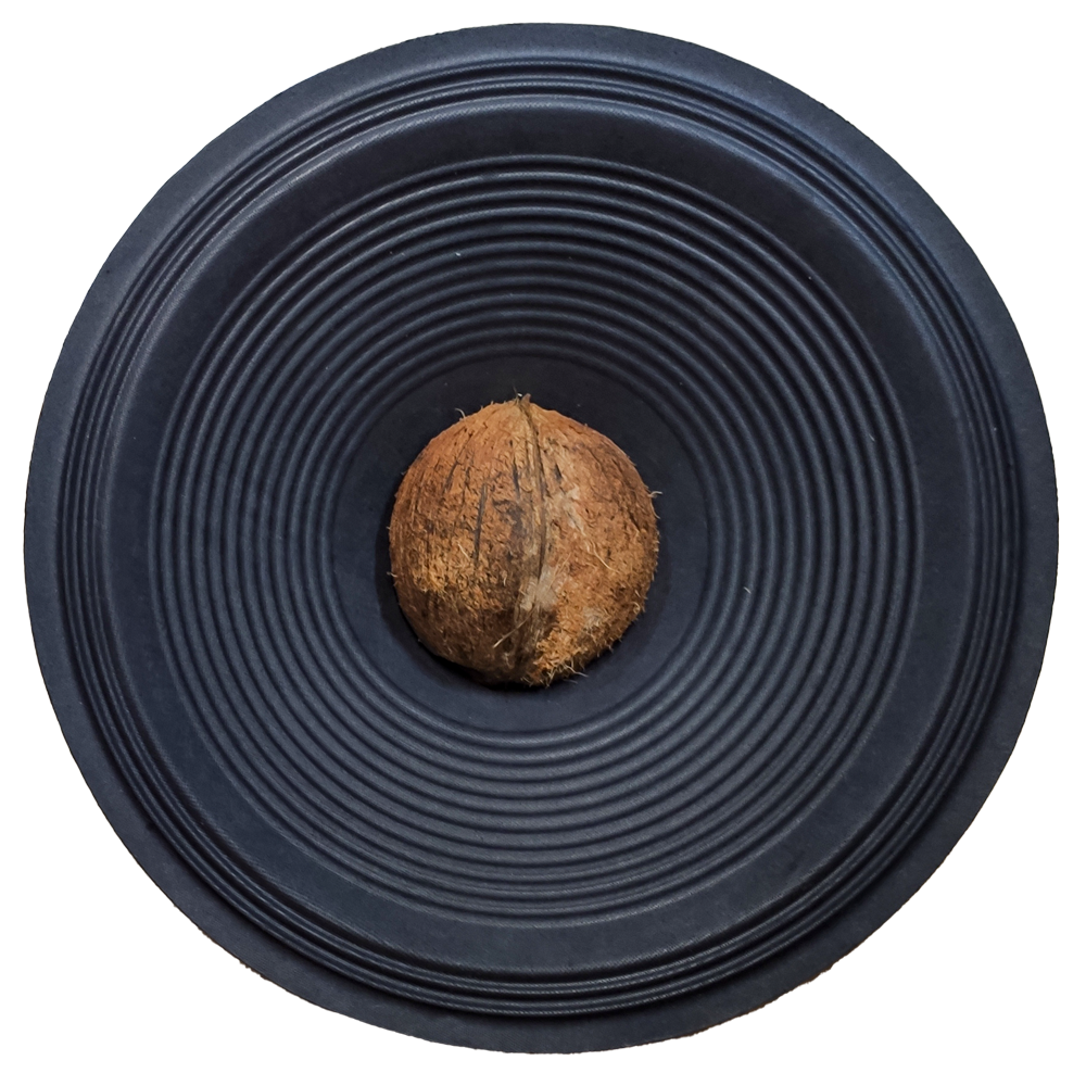 Com um visual vibrante e meio surreal, o dourado da máscara contrasta com os tons terrosos do coco e da pele suada, enquanto o céu ao fundo reforça a sensação tropical e solar da cena, explorando materiais simples e texturas.